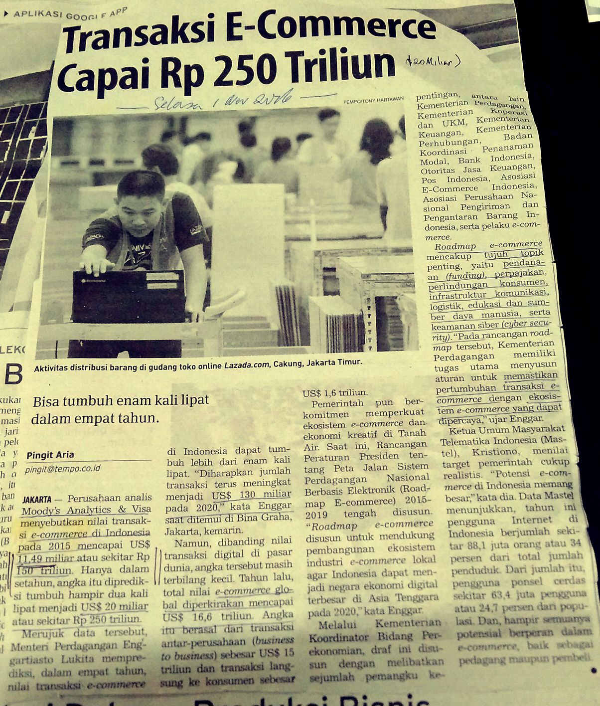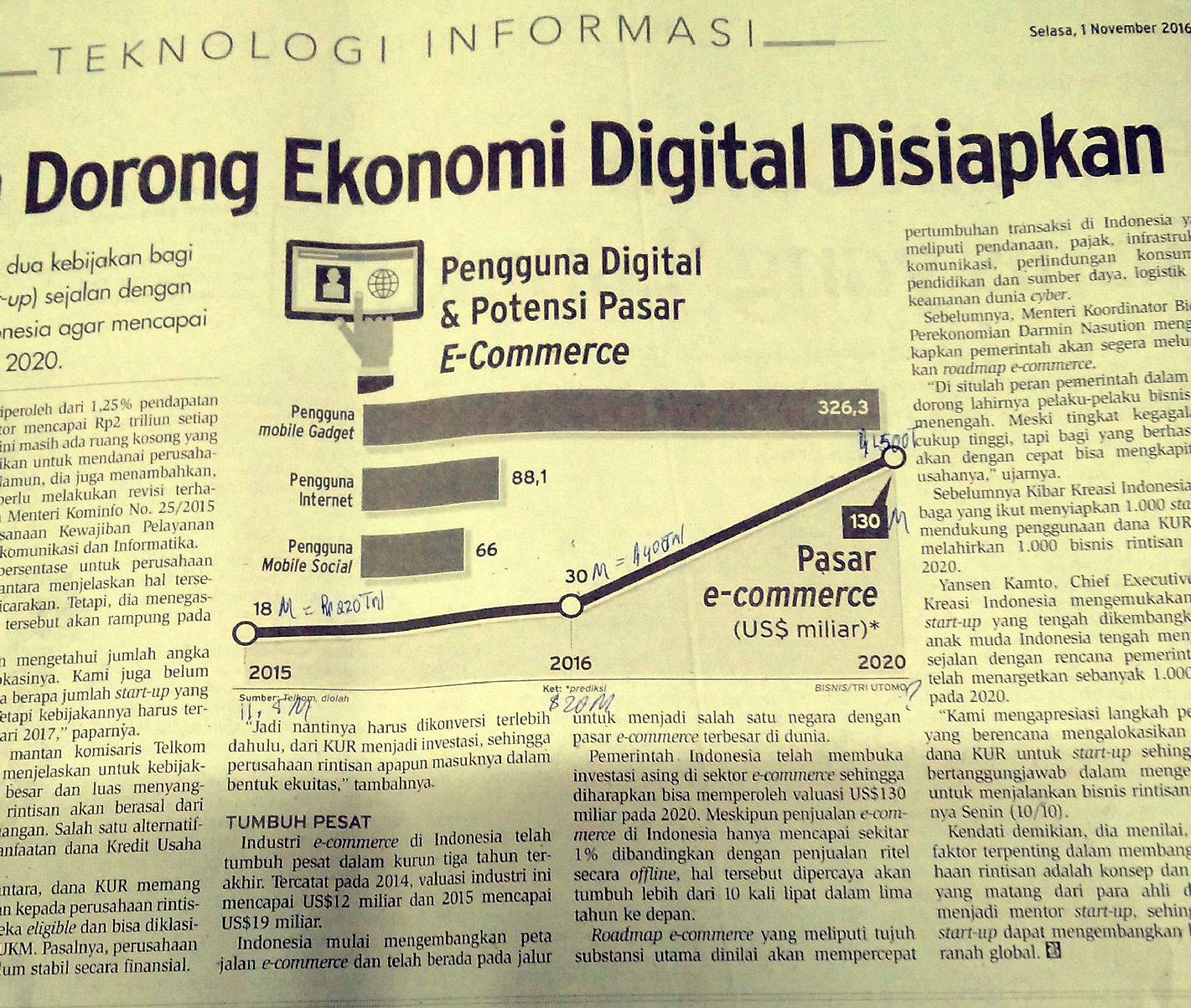 Terlampir dua clipping: Sehari keluar 2 angka pasar ecommerce jauh berbeda. Tempo $20M atau Rp 250Triliun(2016). Bisnis $ 30M (400Triliun (2016) mana yg hrs dirujuk. Selasa (1 Nov2016)?